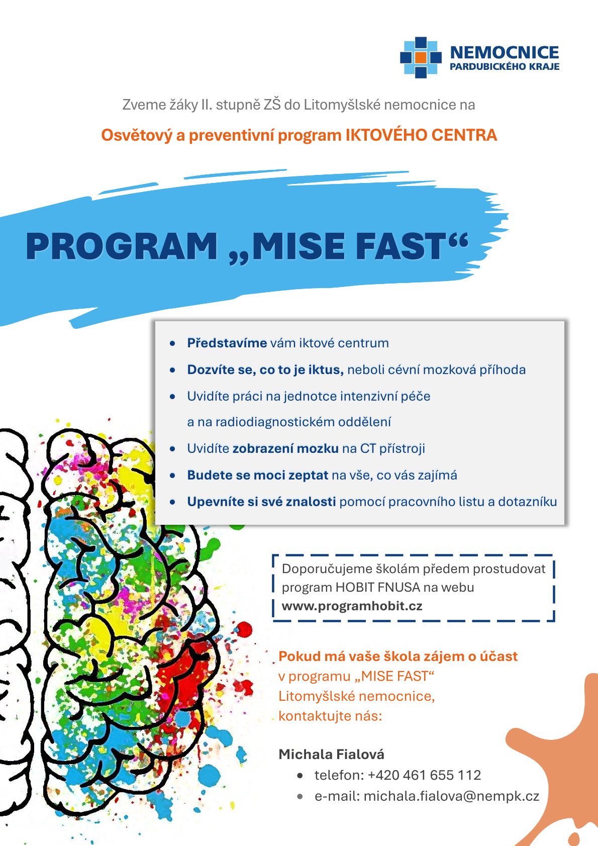 Litomyšlská nemocnice a její iktové centrum připravily pro žáky druhých stupňů základních škol dlouhodobou osvětovou aktivitu, která si klade za cíl vzdělávat veřejnost o prevenci, příznacích a správné reakci na cévní mozkovou příhodu neboli CMP.
